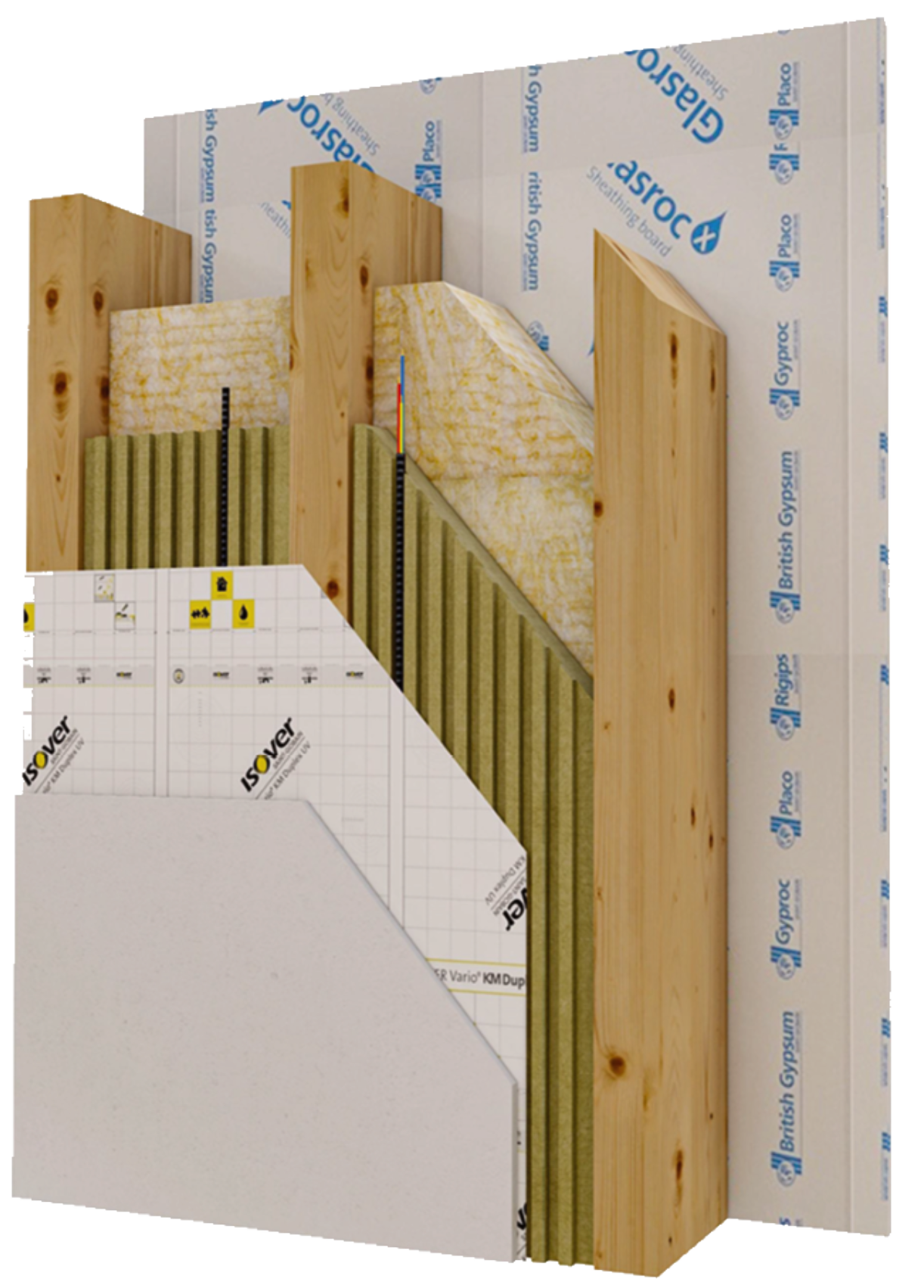• Eine Gipsfaserplatte (British Gypsum) schützt vor Wind, Schlagregen und mechanischen Belastungen.