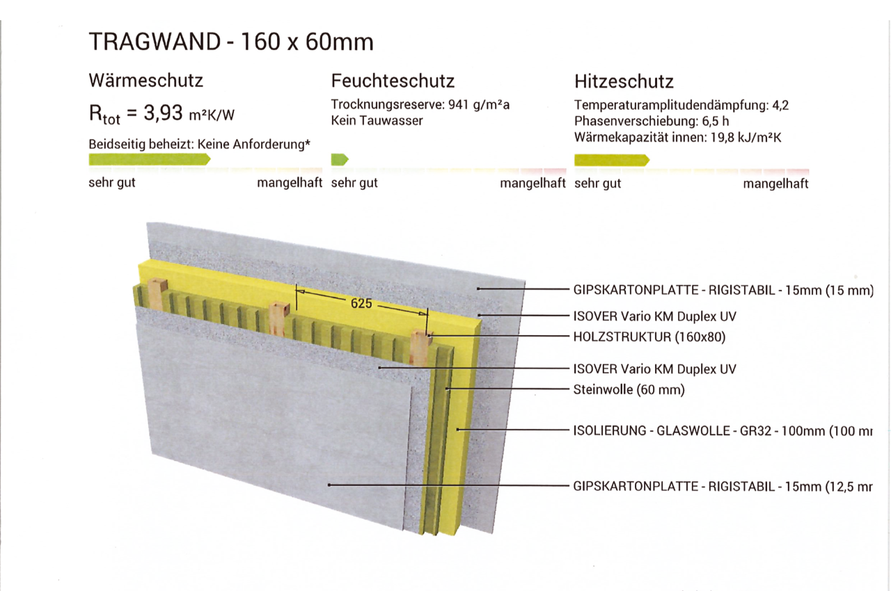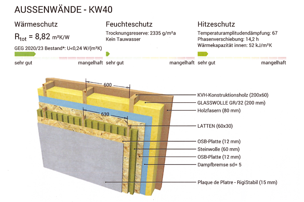 • Energieeffizienz: Der Wandaufbau ist speziell darauf ausgelegt, den KfW-40-Standard zu erfüllen, was zu extrem niedrigen Energiekosten führt.